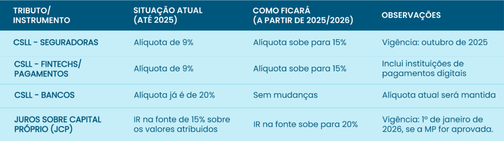 Com o novo Pacote Fiscal, o governo decidiu elevar a alíquota da CSLL de 9% para 15% nos seguintes segmentos: